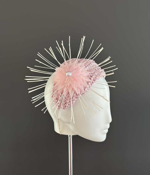 Effortless and refined, The Pink Bandeau crowns the head with perfect balance. Draped in Hand-woven textured Pink braid, it’s finished to the right with a sculptural cluster of hand-cut Pink feather flower, each petal radiating around a luminous pearl.