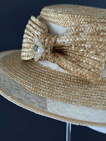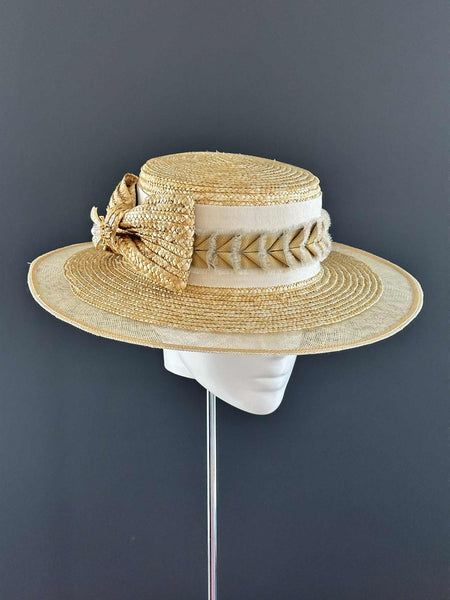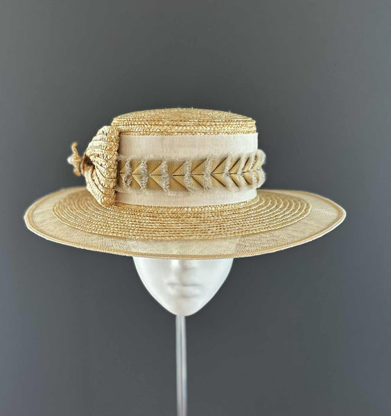 Neutral straw boater hat with a cream sinamay extension, designed for warm-weather occasions.
