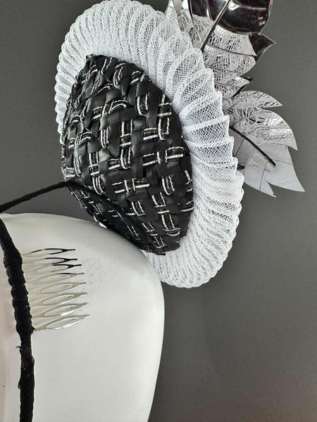 Effortlessly poised, The Black and white Percher rests at the crown with perfect balance. Draped in hand-woven Black and white textured braid—front and back—its silhouette is framed by a whisper of White pleated crin along the edge.